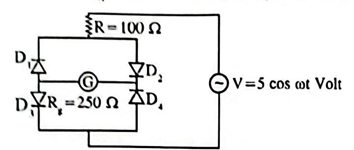14. নিচের চিত্র অনুযায়ী চারটি আদর্শ ডায়োড, একটি রোধ ও একটি গ্যালভানোমিটার সংযোগ দেওয়া হলো । (a) বর্তনীর সর্বোচ্চ তড়িৎ প্রবাহ imax =?(b) গ্যালভানোমিটার কীভাবে DC ভোল্টমিটার হিসেবে কাজ করে চিত্র থেকে ব্যাখ্যা কর ।