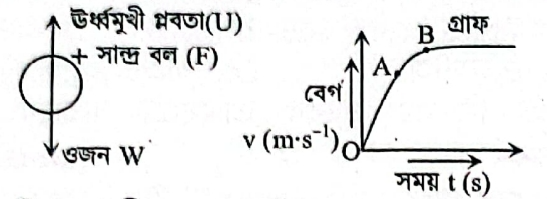 39. (ক)প্রশ্ন-৯১চিত্রে একটি প্রবাহীর মধ্যে দিয়ে মুক্তভাবে পড়ন্ত একটি গোলকের উপর ক্রিয়াশীল বল দেখানো হলো এবং গোলকটির পতনের মুহূর্ত হতে গোলকটির গতিবেগ -সময় গ্ৰাফের মধ্যে দেখানো হলো। প্রবাহীর ঘনত্ব গোলকের ঘনত্বের অর্ধেক।গ্ৰাফটিতে O বিন্দুতে ত্বরণ কত?