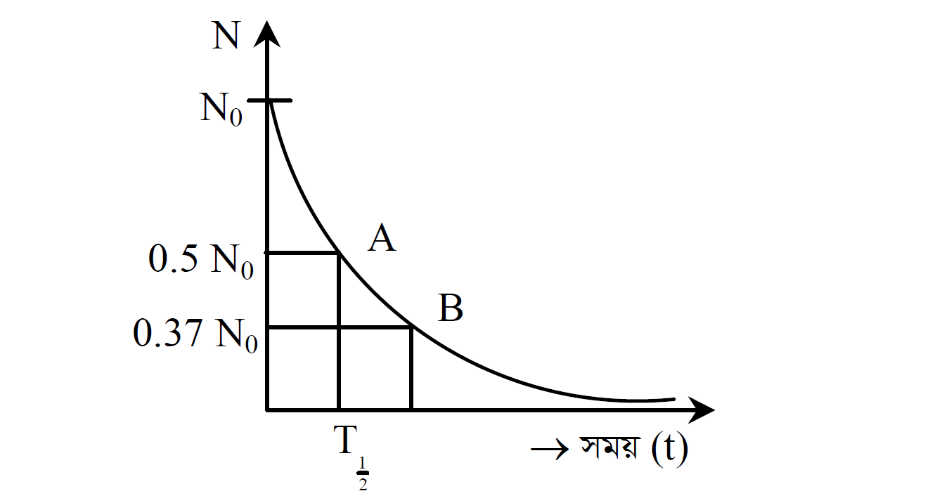পাশের চিত্রে সময়ের সাপেক্ষে অক্ষত তেজস্ক্রিয় পরমাণুর পরিবর্তন দেখানো হলো।উদ্দীপকের তেজস্ক্রিয় পদার্থটির গড় আয়ুর সমান সময়ের পর তার অক্ষত পরমাণুর সংখ্যা B বিন্দুতে হবে কি-না? গাণিতিক বিশ্লেষণে দেখাও।