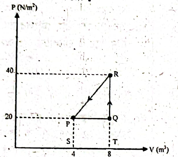 চিত্রে গ্যাসের চাপ ও তাপমাত্রার পরিবর্তন দেখানো হয়েছে। এখানে, Q থেকে R এ যেতে তাপগতীয় ব্যবস্থায় 80J তাপশক্তি সরবরাহ করা হয়েছে।