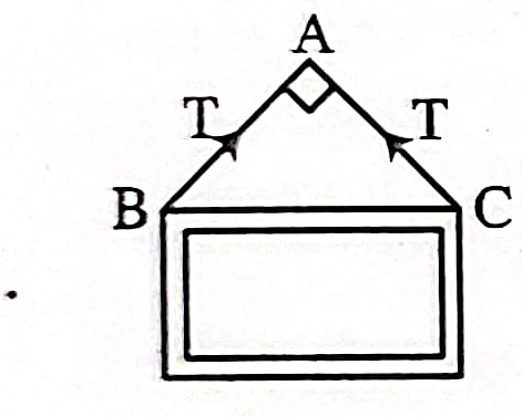 চিত্রে সমান দৈর্ঘ্যের দুটি রশি AB, AC দ্বারা 5 kg ওজনের কাঠের ফ্রেমটি ঝুলানো হলে প্রতিটি রশির টান T=?