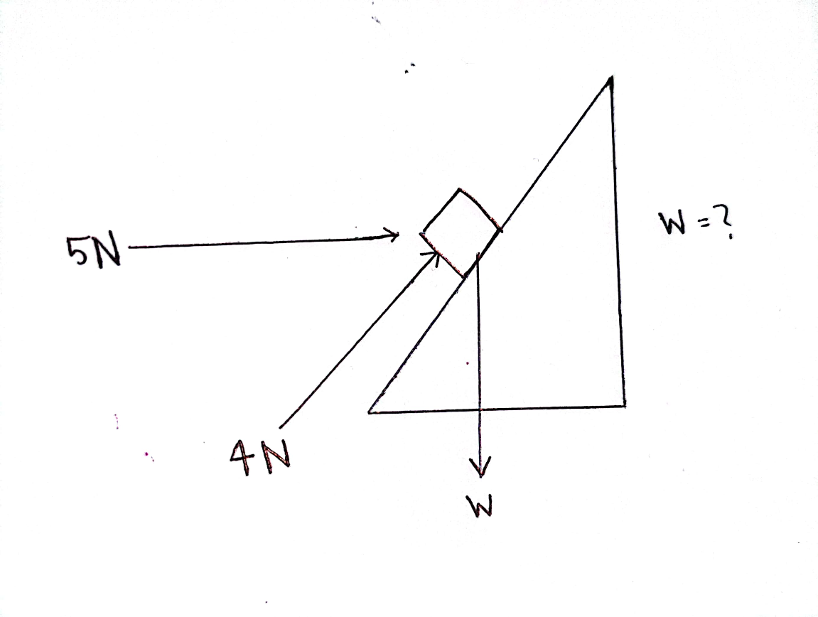 একটি হেলানো সমতলের দৈর্ঘ্য ও ভূমির সমান্তরাল ক্রিয়াশীল বল যথাক্রমে 4N ও 5N। বলদ্বয় প্রত্যেকে একক ভাবে W ওজনের কোন বস্তুকে তলের উপর স্থির রাখতে পারে। W=?