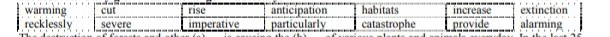 The destruction of forests and other (a) — is causing the (b) — of various plants and animals everyday. In the last 25 years alone the world has lost one-third of its natural wealth. Forests are being (c) — down. Moreover, they are being burnt (d) — resulting in an (e) — in carbon dioxide and ultimately the water level is (f) — as a consequence of global (g) —.It is (h) — that the new century will face an overwhelming environment (i) —. It is therefore (j) — to check the reckless pollution of the environment..