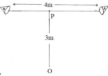 শাহীন তার কলেজের একটি অনুষ্ঠানে 4m দৈর্ঘ্যের স্টেজ তৈরি করল। স্টেজের এক প্রান্তে 1 mW ক্ষমতার একটি স্পীকার A স্থাপন করল, স্টেজের মধ্যবিন্দু P হতে সোজাসুজি 3m দূরে বিন্দুতে একজন শ্রোতার নিকট শব্দের তীব্রতা কম হওয়ায় সে স্টেজের মধ্যবিন্দু P হতে অপর প্রান্তে একই দূরত্বে ও একই ক্ষমতার অপর একটি স্পীকার B স্থাপন করল। নিচের চিত্রে তা দেখানো হলো:
