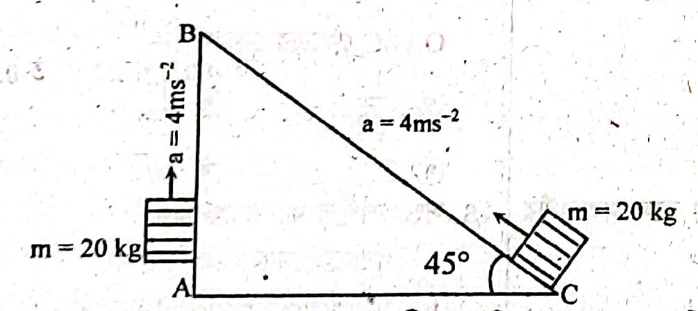 20 kg ভরের একটি বস্তুকে চিত্রানুযায়ী A বিন্দু থেকে B বিন্দুতে উঠানো হলো। একই ডরের অপর একটি বস্তুকে C থেকে B বিন্দুতে নেয়া হলো।প্রথম ক্ষেত্রে কাজের পরিমাণ নির্ণয় করো।