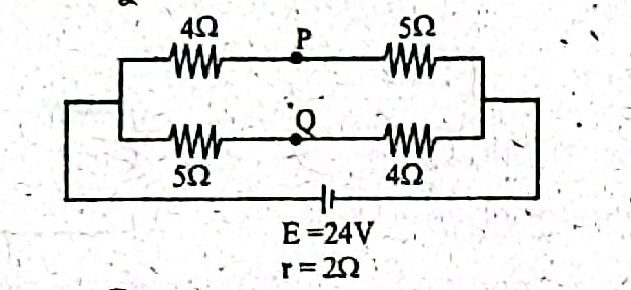 নিচের বর্তনী থেকে প্রশ্নগুলোর উত্তর দাও।বর্তনীর তড়িৎ প্রবাহের মান নির্ণয় কর।
