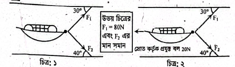 চিত্র -২ এ F1 ও F2 এর শুধু মানের কিরূপ পরিবর্তন করলে উভয় চিত্রের নৌকার সামনের দিকের বলের মান সমান হবে।তা গাণিতিকভাবে বিশ্লেষণ করো।