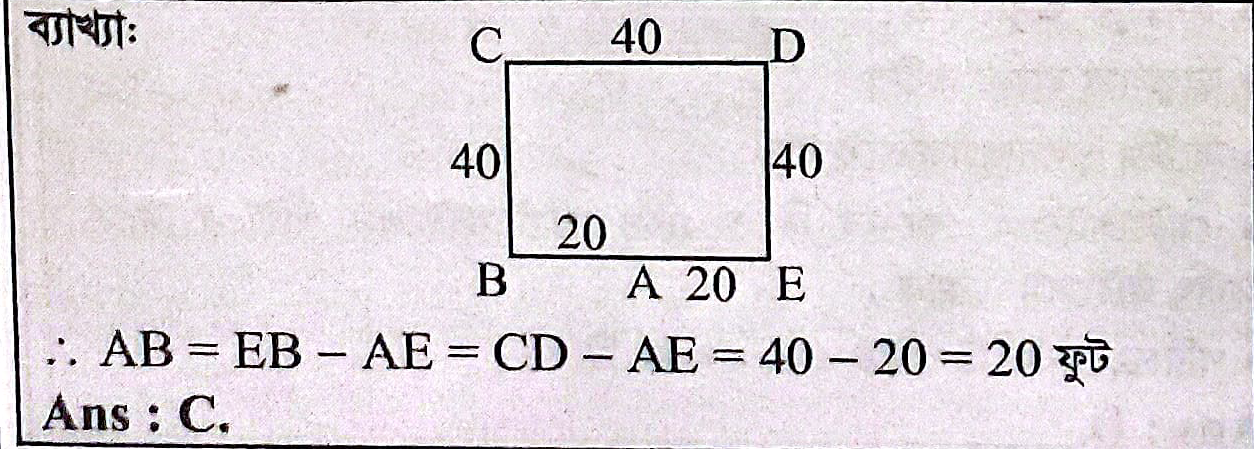 একজন লোক A অবস্থান থেকে হেটে ডানদিকে ২০ ফুট অতঃপর বামদিকে ৪০ ফুট ,তারপর বামদিকে ৪০ ফুট এবং সর্বশেষ বামদিকে ৪০ ফুট গিয়ে B অবস্থান পৌছালো। A ও B এর মধ্যকার দূরত্ব কত ফুট ?