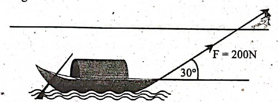 রিদা দাদার বাড়িতে গিয়ে 200m প্রস্থের নদীতে স্রোতের সাথে 120° কোণে 10 km/h বেগে নৌকা চালিয়ে ঠিক বিপরীত পাড়ে পৌছায়। রিদা ধারণা করল স্রোতহীন নদীতে নৌকাটি স্থিরবস্থা থেকে চিত্রের ন্যায় নদীর প্রস্থের সমান দূরত্ব অতিক্রম করতে পূর্বের তুলনায় কম সময় লাগবে। নৌকার ভর 500 kg।