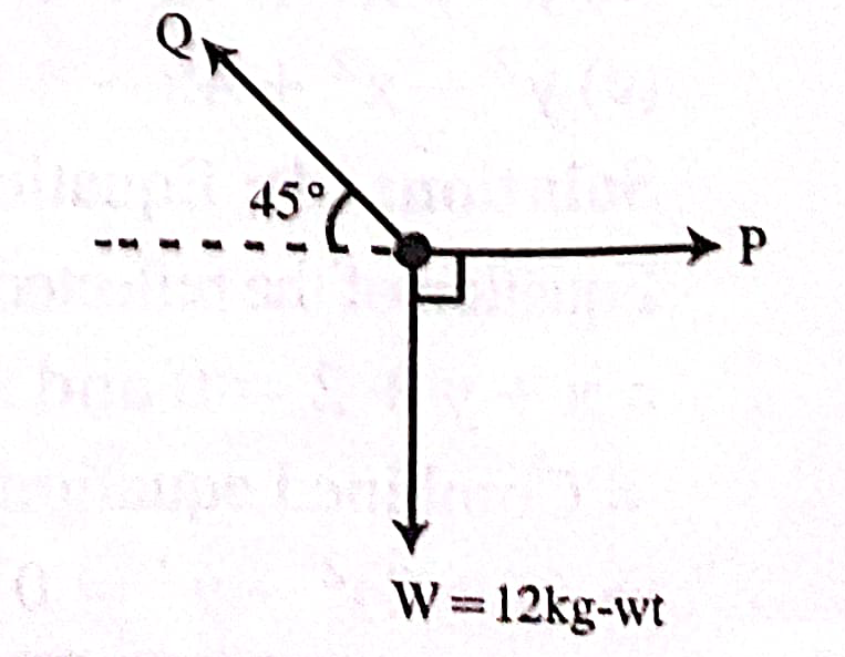 A hanging body weighing 12 kg is kept in a position by applying two forces P and Q on it. P is acting horizontally while Q is acting by making an angle of 45° with the horizontal. The magnitude of the Q is-