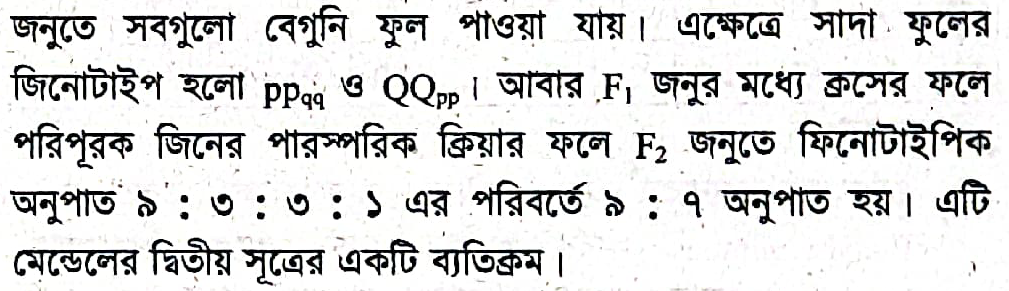 | PPqq | সাদা | 'P' জিন বেগুনি রং তৈরিতে বাধা দেয়। |