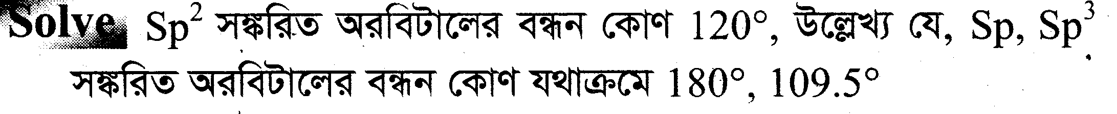 sp2 সংকরিত অরবিটালের বন্ধন কোণ 120° হওয়ার কারণ 🤔: sp2 সংকরণ প্রক্রিয়ায় একটি s অরবিটাল এবং দুটি p অরবিটাল মিশ্রিত হয়ে তিনটি নতুন সমতুল্য অরবিটাল তৈরি করে। এই তিনটি অরবিটাল ত্রিকোণীয় প্ল্যানার (Trigonal Planar) জ্যামিতি গঠন করে। ত্রিকোণীয় প্ল্যানার জ্যামিতিতে, প্রতিটি অরবিটালের মধ্যে পারস্পরিক বিকর্ষণ সর্বনিম্ন রাখার জন্য তারা 120° কোণে অবস্থান করে। 🤩 গাণিতিকভাবে ব্যাখ্যা: আমরা জানি, কোনো পরমাণুর চারপাশে ইলেকট্রন মেঘের মধ্যে বিকর্ষণ সর্বনিম্ন হলে কাঠামোটি সবচেয়ে স্থিতিশীল হয়। sp2 সংকরিত অরবিটালগুলো একটি ত্রিমাত্রিক স্থানে নিজেদেরকে এমনভাবে সাজায় যেন তাদের মধ্যেকার কোণ \( \frac{360^\circ}{3} = 120^\circ \) হয়। 🥳 অতএব, sp2 সংকরিত অরবিটালের বন্ধন কোণ 120°। 🎉