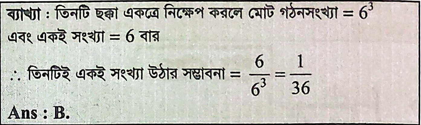 তিনটি ছক্ক??? একবার নিক্ষেপ করা হল। তিনটিতেই একই সংখ্যা পাওয়ার সম্ভাবনা কত?