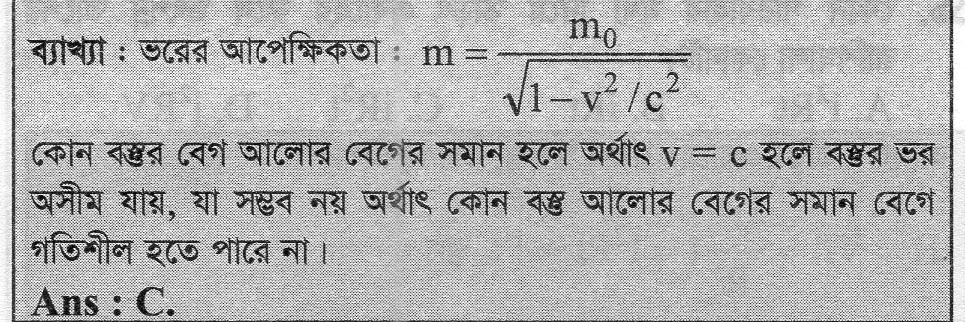 সীমিত ভর \(m_0\) বিশিষ্ট কোন বস্তু কণা শূন্যস্থানে আলোর গতিতে চলতে পারেনা। এর স্বপক্ষে সবচেয়ে গ্রহণযোগ্য যুক্তি পাওয়া যায় আপেক্ষিকতা তত্ত্বের ভর-বেগ সমীকরণ থেকে। ভর-বেগ সমীকরণটি হলো: \(m = \frac{m_0}{\sqrt{1 - \frac{v^2}{c^2}}}\) এখানে, * \(m\) = গতিশীল বস্তুর ভর * \(m_0\) = স্থির বস্তুর ভর (বস্তুর নিজস্ব ভর) * \(v\) = বস্তুর বেগ * \(c\) = আলোর বেগ যদি \(v = c\) হয়, তবে সমীকরণটি দাঁড়ায়: \(m = \frac{m_0}{\sqrt{1 - \frac{c^2}{c^2}}} = \frac{m_0}{\sqrt{1 - 1}} = \frac{m_0}{0} = \infty\) সুতরাং, যদি কোন বস্তু আলোর দ্রুতিতে (c) চলে, তবে তার ভর অসীম (\(\infty\)) হয়ে যাবে। যেহেতু কোন বস্তুর ভর অসীম হওয়া সম্ভব নয়, তাই সীমিত ভরের কোন বস্তু আলোর দ্রুতিতে চলতে পারে না। 🚫🚀