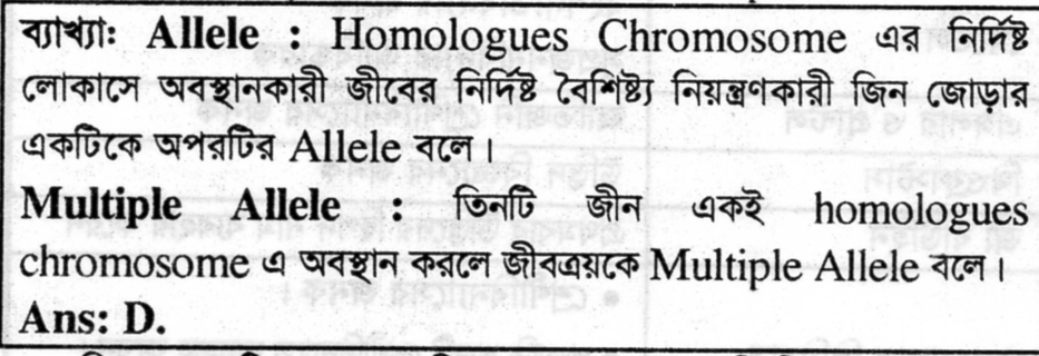 - Multiple allele: এটি এমন একটি জেনেটিক অবস্থা যেখানে একই জেনের বিভিন্ন ধরণের (অর্থাৎ, একাধিক আলেল) উপস্থিত থাকে।