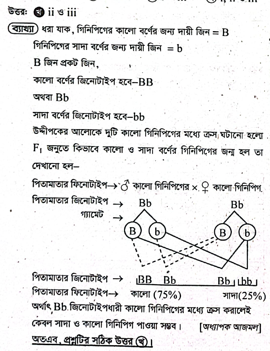 উপরের আলোচনা থেকে এটি স্পষ্ট যে পিতামাতার জিনোটাইপ Bb,Bb অথবা Bb,bb হতে পারে। তাই, সঠিক উত্তর হলো: ii ও iii।