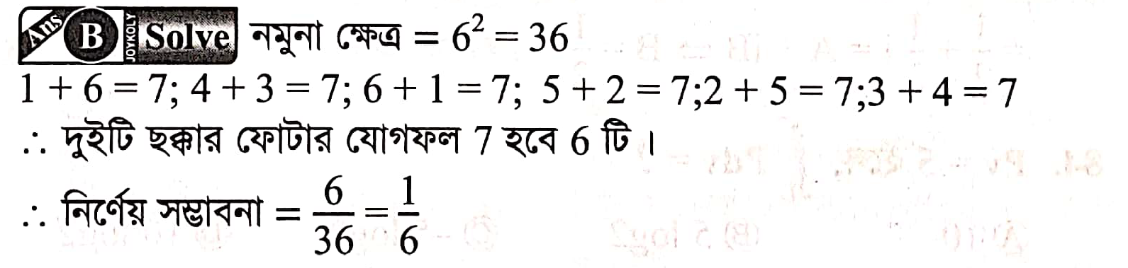 প্রশ্নঃ দুইটি ছক্কা একই সাথে নিক্ষেপ করা হল। দুইটি ছক্কার উপরের ফোঁটার মোট সংখ্যার যোগফল 7 হবার সম্ভাবনা কত?