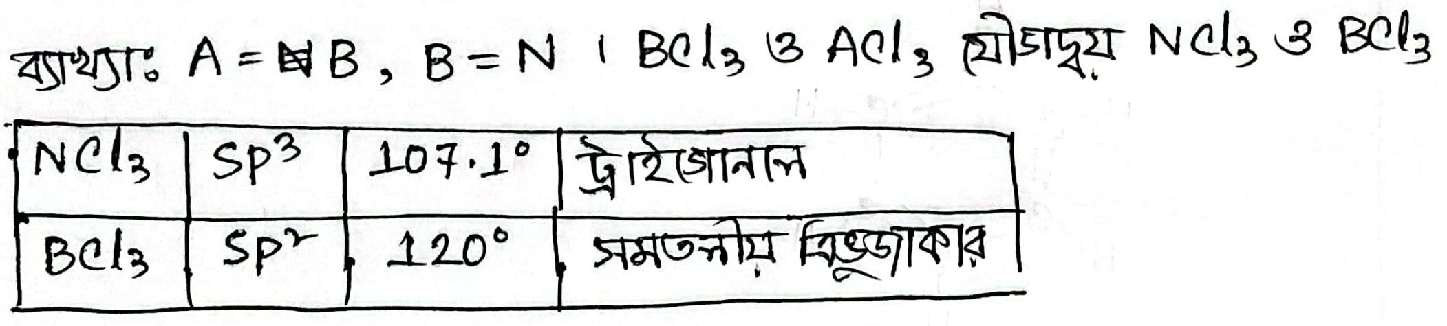 - ACl3 (BCl3) এর বন্ধন কোণ 120° এর কাছাকাছি, কারণ এর ত্রিকোণীয় প্ল্যানার (Trigonal Planar) জ্যামিতি।