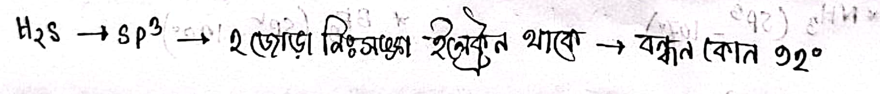 - বন্ধন কোণের হ্রাস: অক্সিজেনের চেয়ে সালফারের আকার বড় হওয়ায় নিঃসঙ্গ ইলেকট্রন জোড়গুলোর বিকর্ষণ তুলনামূলকভাবে কম হয়। তাই H2O এর বন্ধন কোণ (104.5°) এর চেয়ে H2S এর বন্ধন কোণ (92.2°) কম হয়। 🥶