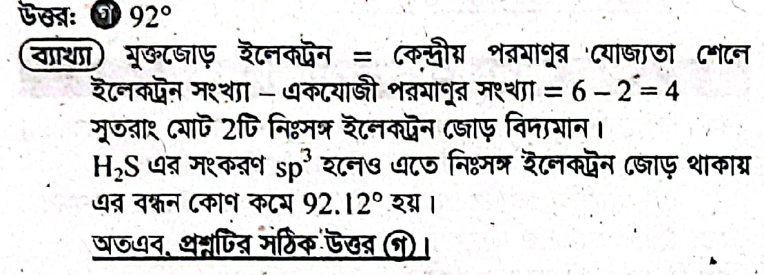সুতরাং, নিঃসঙ্গ ইলেকট্রন জোড়ের বিকর্ষণের কারণে H2S অণুর বন্ধন কোণ 92°।