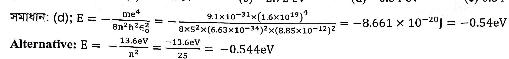 সুতরাং, হাইড্রোজেন পরমাণুর ৫ম বোর কক্ষের ইলেকট্রনের শক্তি প্রায় \(-0.54\) eV। 🎉