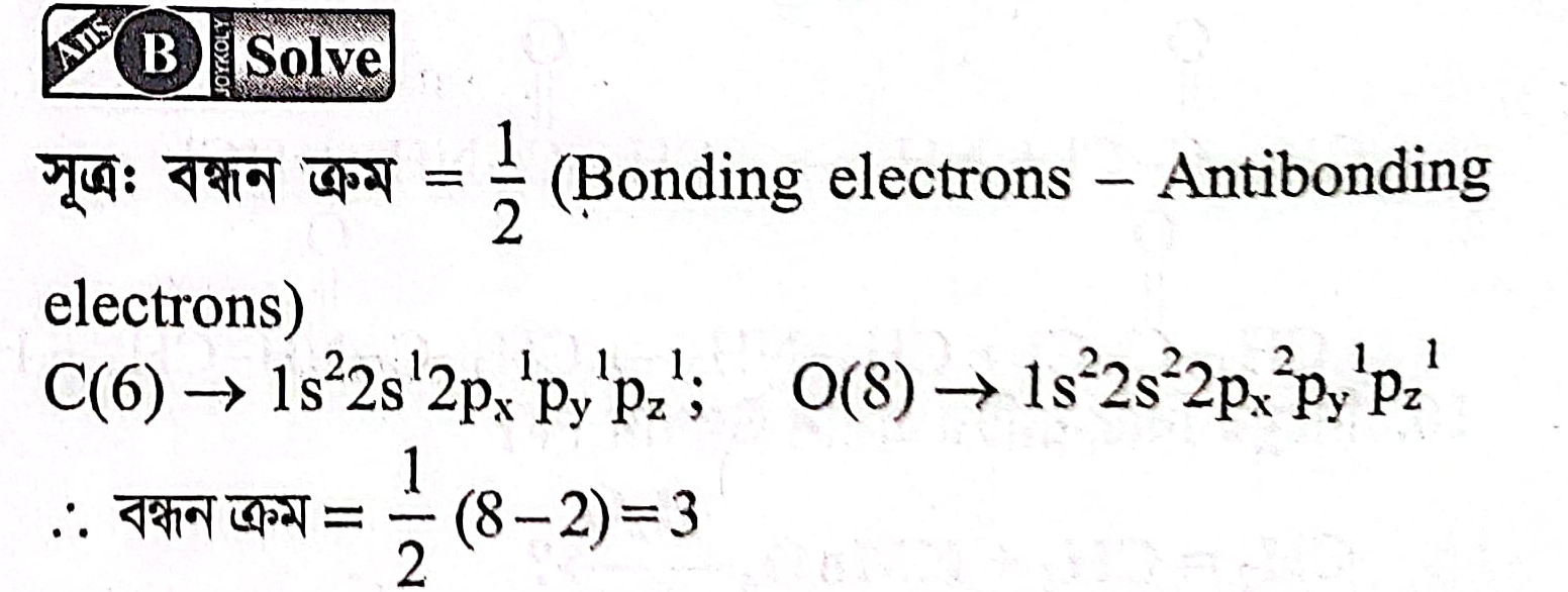 অতএব, CO অণুর বন্ধন ক্রম 3 🥳। এর অর্থ কার্বন ও অক্সিজেনের মধ্যে ত্রৈধ বন্ধন (Triple Bond) বিদ্যমান। 🧪