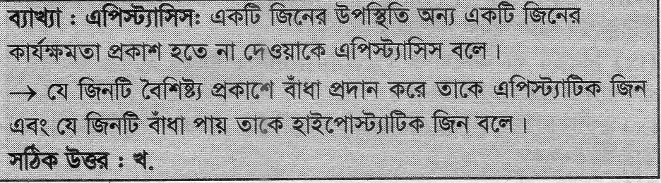 এপিস্ট্যাসিস 🧬🧬🧬 হলো একটি জিনগত ঘটনা। এখানে একটি জিন (এপিস্ট্যাটিক জিন) অন্য একটি নন-অ্যালিলিক জিনের (হাইপোস্ট্যাটিক জিন) প্রকাশকে প্রভাবিত বা দমন করে। মেন্ডেলের বংশগতির সূত্রে যেখানে একটি জিনের অ্যালিল অন্যটির উপর প্রকট হয়, এপিস্ট্যাসিস সেখানে দুটি ভিন্ন জিনের মধ্যে মিথস্ক্রিয়া ঘটায়।🤔