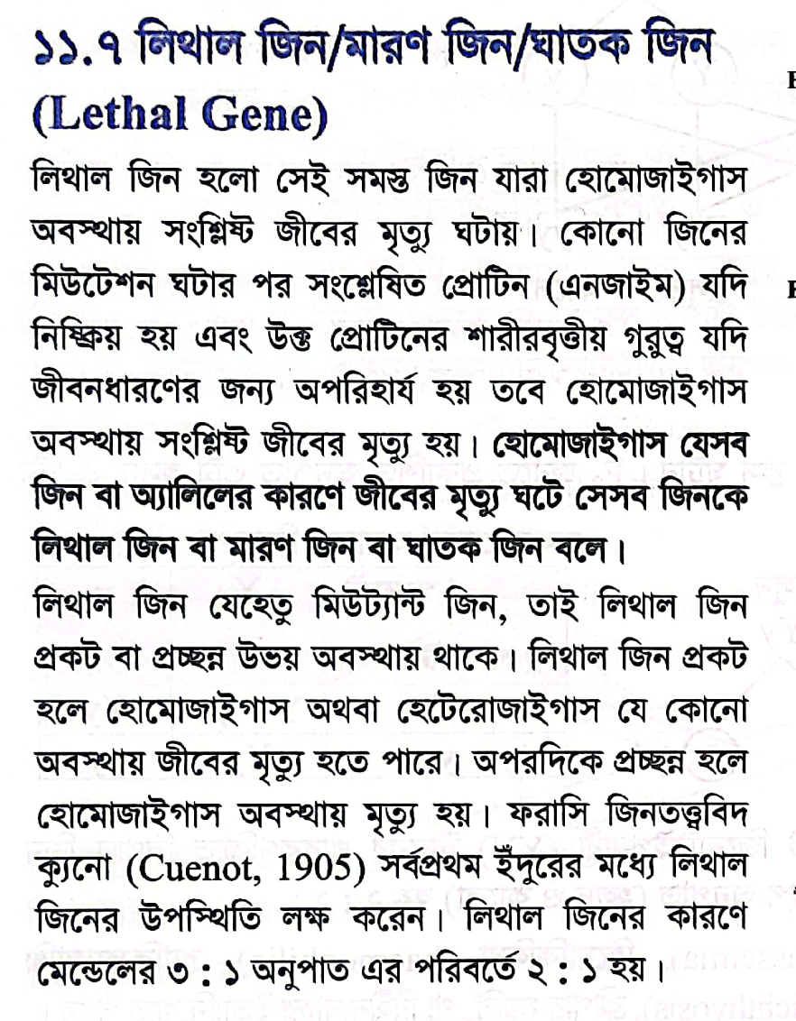 সুতরাং, লিথাল জিন একটি মারাত্মক মিউট্যান্ট জিন যা জীবের মৃত্যু ঘটাতে পারে এবং এর ফলে ফিনোটাইপিক অনুপাত ১:২:১ হয়।🧬⚰️⚖️