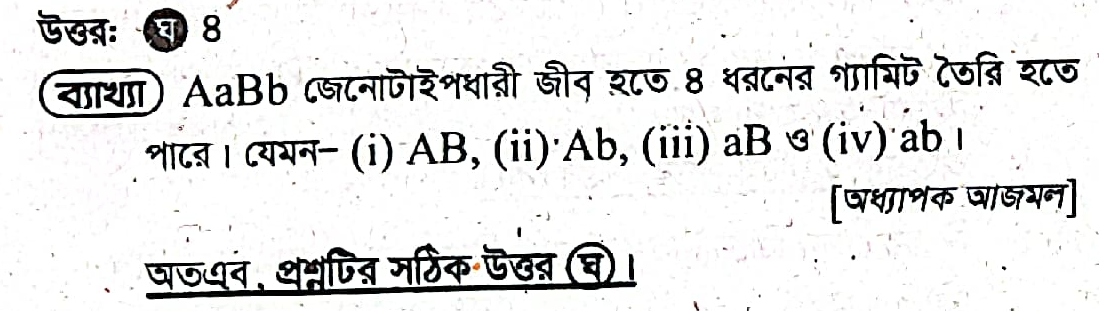 AaBb জিনোটাইপধারী জীব থেকে কয় ধরনের গ্যামেট তৈরি হতে পারে?
