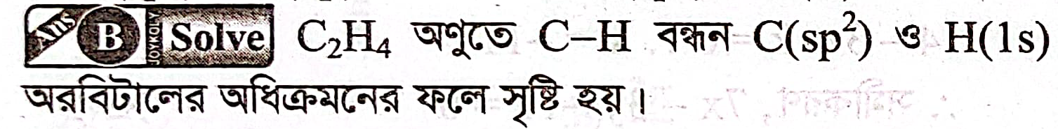 - অতএব, C2H4 অণুতে প্রতিটি C-H বন্ধন C(sp2) + H(1s) অরবিটালের অধিক্রমণের মাধ্যমে গঠিত হয়।
