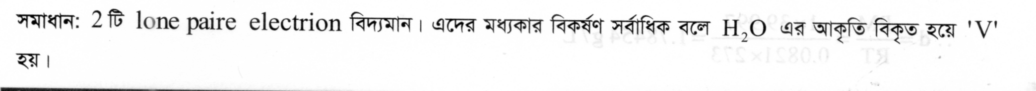 | H2O | V-আকৃতি (Bent) | দুটি নিঃসঙ্গ ইলেকট্রন জোড় আছে। |