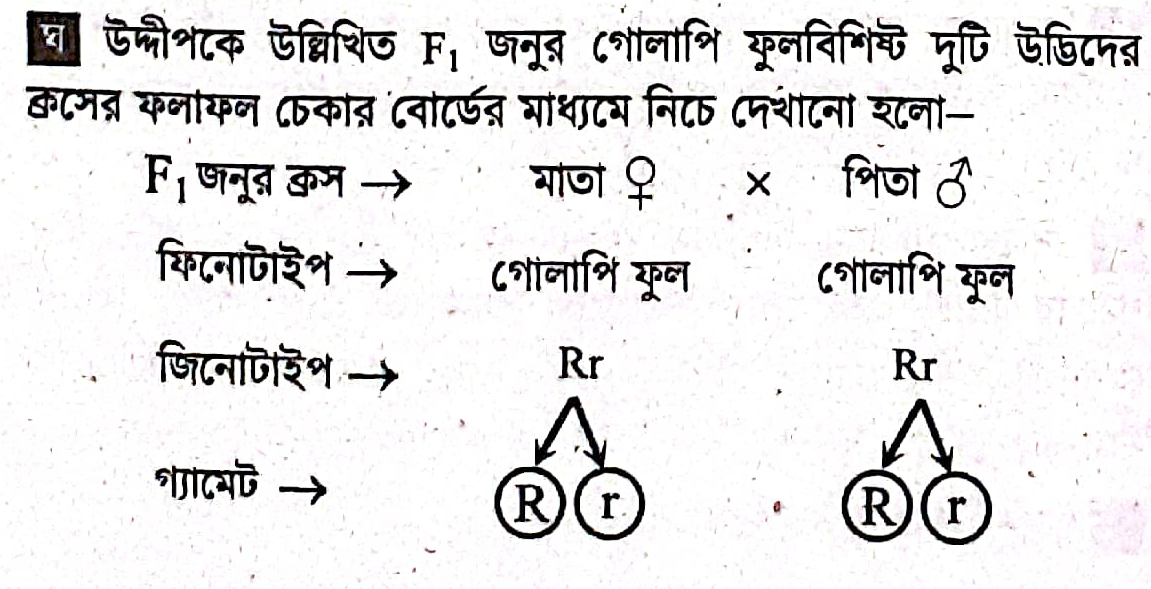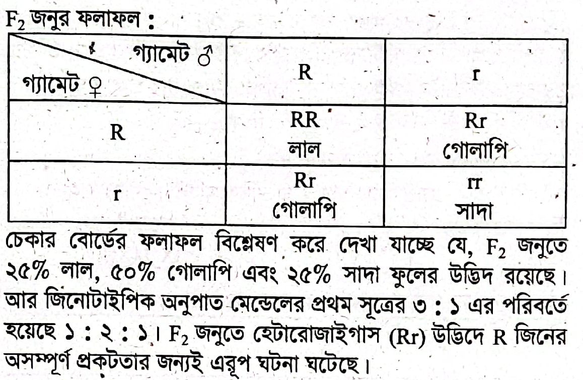 লাল ফুল ও সাদা ফুল এর সাথে সংকরায়ন ঘটালে F1 বংশধরে গোলাপি ফুল হয় এবং সেখান থেকে F2 বংশধর সৃষ্টি হয়।