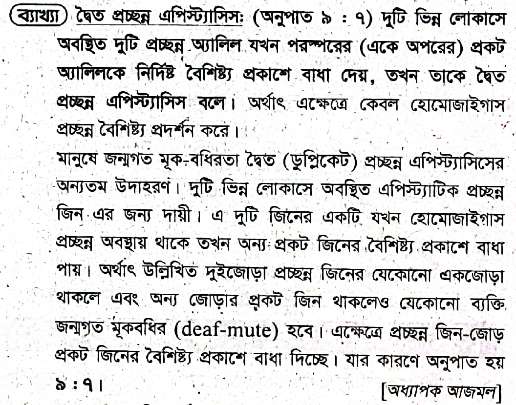 জৈব প্রচ্ছন্ন এপিস্ট্যাসিস হলো একটি বিশেষ ধরনের বংশগতি যেখানে একটি প্রচ্ছন্ন অ্যালিল অন্য একটি জিনের প্রকাশকে মাস্ক করে দেয়। এর ফলে ফিনোটাইপিক অনুপাতটি মেন্ডেলের সাধারণ অনুপাত থেকে ভিন্ন হয় এবং ৯:৭ অনুপাতে প্রকাশ পায়।🤔