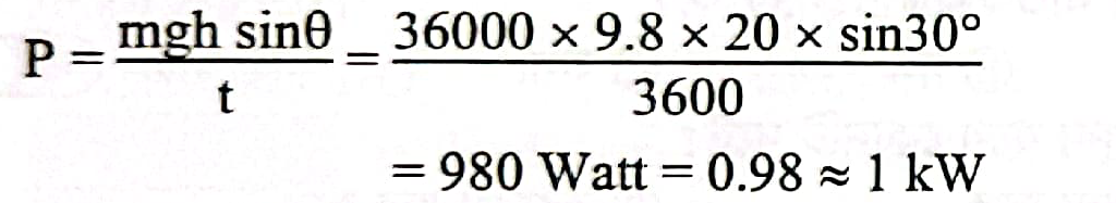 পাম্পের ক্ষমতা নির্ণয়: \( \bf প্রদত্ত\): * কোণ, \(\theta = 30^\circ \) * পাইপের দৈর্ঘ্য, \(l = 20m \) * ভর, \(m = 36000 kg \) * সময়, \(t = 1 hour = 3600 s \) * অভিকর্ষজ ত্বরণ, \(g = 9.8 ms^{-2} \) \( \bf প্রয়োজনীয়\ উচ্চতা\ নির্ণয় \) : পানি কতটুকু উচ্চতায় উঠেছে, তা বের করতে হবে। \( h = l \sin\theta = 20 \times \sin30^\circ = 20 \times \frac{1}{2} = 10 m \) \( \bf কাজ\ নির্ণয় \) : কাজ, \(W = mgh = 36000 \times 9.8 \times 10 = 3528000 J \) \( \bf ক্ষমতা\ নির্ণয় \) : ক্ষমতা, \(P = \frac{W}{t} = \frac{3528000}{3600} = 980 W \) \( \bf কিলোওয়াটে\ রূপান্তর \) : \(P = \frac{980}{1000} = 0.98 kW \approx 1 kW \) সুতরাং, পাম্পটির ক্ষমতা প্রায় \( 1 kW \) । 🎉