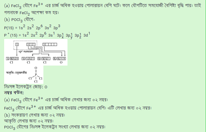 প্রশ্নঃ (a) FeCl2 অপেক্ষা FeCl3 এর গলনাংক নিম্ন কেন? (b) POCl3 যৌগের কেন্দ্রীয় পরমাণুর সংকরণ, আকৃতি ও কেন্দ্রীয় পরমাণুতে নিঃসঙ্গ ইলেকট্রন সংখ্যা ব্যাখ্যা কর।