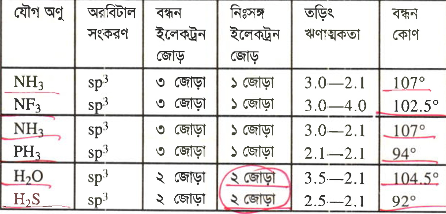 H2O এর বন্ধন কোণের মান \(104.5^\circ\)। 💧 ব্যাখ্যা: জলের অণু \(sp^3\) সংকরিত। অক্সিজেনের পরমাণুতে দুটি বন্ধন জোড় (Bond pair) এবং দুটি নিঃসঙ্গ জোড় (Lone pair) ইলেকট্রন বিদ্যমান। নিঃসঙ্গ জোড় ইলেকট্রন বন্ধন জোড় ইলেকট্রন অপেক্ষা বেশি স্থান দখল করে। ফলে, নিঃসঙ্গ জোড় - নিঃসঙ্গ জোড় বিকর্ষণ, নিঃসঙ্গ জোড় - বন্ধন জোড় বিকর্ষণ অপেক্ষা বেশি হওয়ার কারণে বন্ধন কোণ \(109.5^\circ\) থেকে কমে \(104.5^\circ\) হয়। 🧪 \(H-O-H\) বন্ধন কোণ : \(104.5^\circ\) 🥰