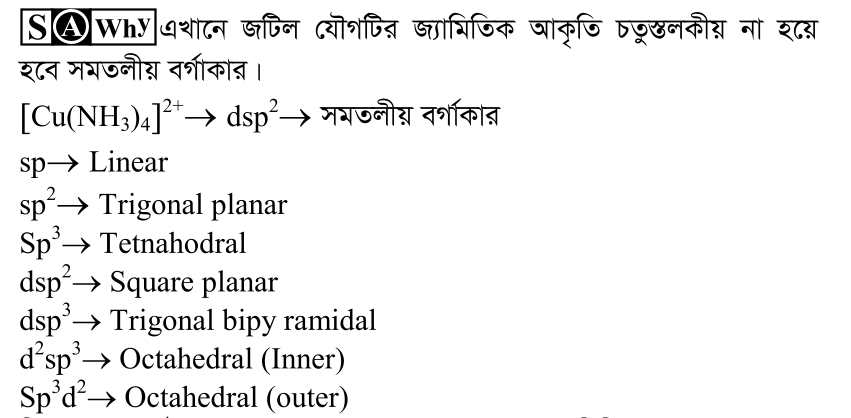 [Cu(NH3)4]2+ একটি জটিল আয়ন। এর জ্যামিতিক আকৃতি সমতলীয় বর্গাকার। নিচে এর গঠন এবং কারণ ব্যাখ্যা করা হলো: