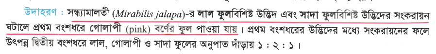 এখানে, বিশুদ্ধ লাল ফুল ♂ এবং বিশুদ্ধ সাদা ফুল ♀ এর মধ্যে সংকরায়ণ ঘটানো হয়েছে। যেহেতু কোনো বৈশিষ্ট্যের জিনই একে অপরের উপর প্রকট নয়, তাই এটি অসম্পূর্ণ প্রকটতার (Incomplete Dominance) উদাহরণ। এর ফলে F1 জনুতে সৃষ্ট ফুলগুলো লালও হবে না, আবার সাদাও হবে না; বরং একটি নতুন ফিনোটাইপ সৃষ্টি হবে - গোলাপি। এরপর F1 জনুর মধ্যে স্ব-পরাগায়ন ঘটানো হলে F2 জনুতে ফিনোটাইপের অনুপাত দাঁড়াবে ১:২:১।