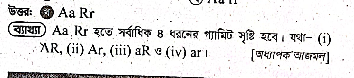 প্রশ্নটি হলো, "Aa Rr" জিনোটাইপ থেকে কয় ধরনের গ্যামিট সৃষ্টি হতে পারে এবং কেন?