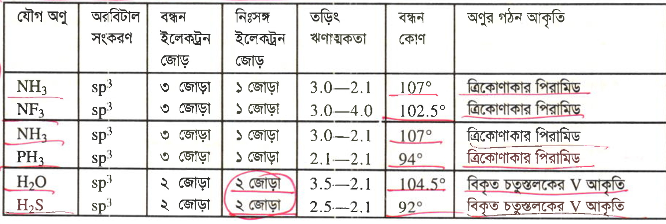 | NH3 | 107° | নাইট্রোজেনের উচ্চ তড়িৎ ঋণাত্মকতা এবং sp3 সংকরায়ন বিদ্যমান। |