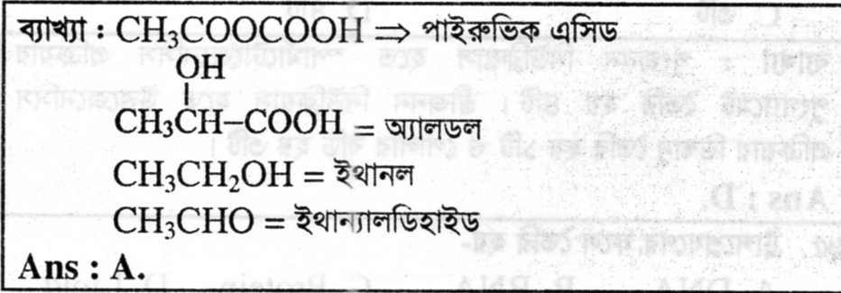 Option A Explanation: CH3COCOOH (অথবা অ্যাসেটিক অ্যাসিডের মতো সংক্ষিপ্ত নামের সাথে পরিচিত) একটি কার্বক্সিলিক অ্যাসিড। এটি একটি পাইরুভিক অ্যাসিড নয়। নিচে এর বৈশিষ্ট্যসমূহ দেওয়া হলো: