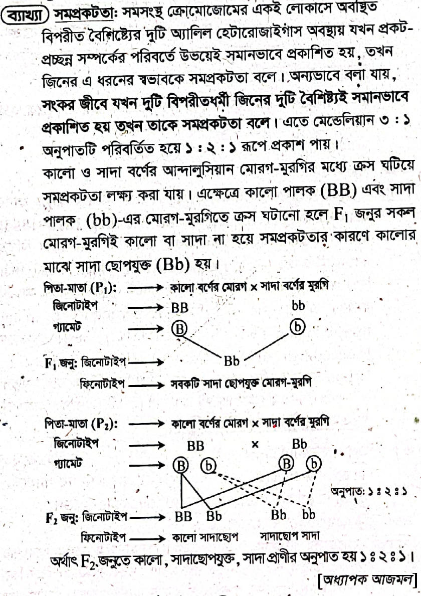 সমপ্রকটতা (Codominance) হলো বংশগতির একটি প্রক্রিয়া। যেখানে দুটি ভিন্ন অ্যালিলই ফিনোটাইপে সমানভাবে প্রকাশিত হয়। এক্ষেত্রে কোনো অ্যালিলই অন্যটির উপর প্রকট (Dominant) থাকে না।🧬