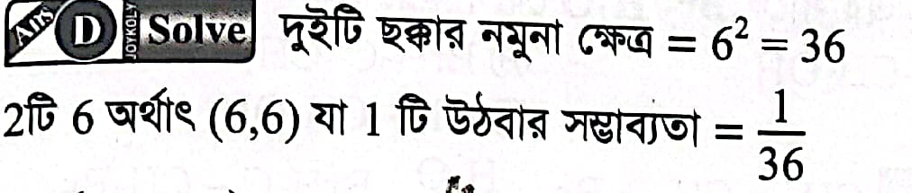 প্রশ্নঃ দুইটি ছক্কা একত্রে নিক্ষেপ করা হলে, দুটি ছয় উঠার সম্ভাব্যতা নির্ণয় কর।