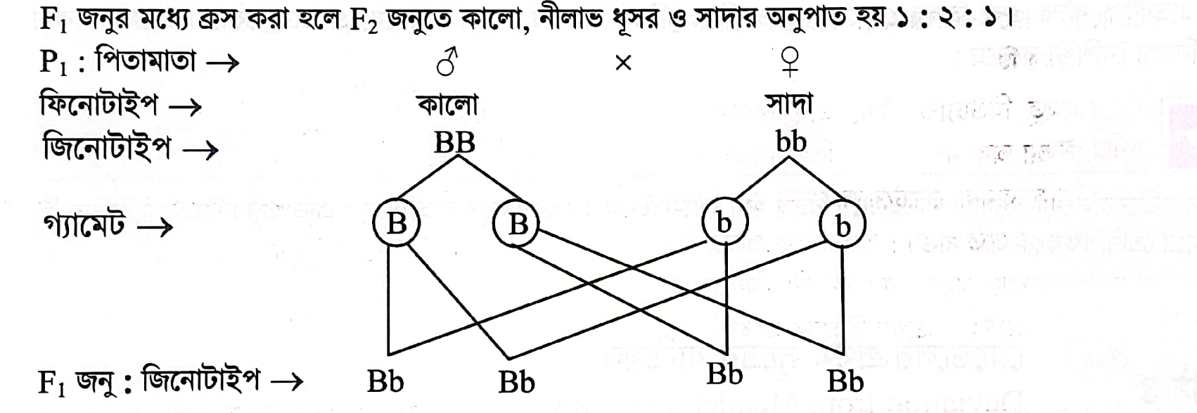 - ক্রসের ফলাফল: যেহেতু অপত্য বংশে সাদা গিনিপিগ (bb) পাওয়া গেছে, তাই পিতামাতা উভয়ের মধ্যেই অবশ্যই একটি করে প্রচ্ছন্ন অ্যালিল (b) থাকতে হবে।